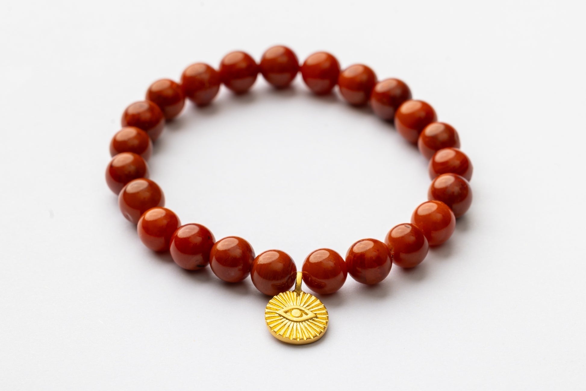 Features 23 8mm Red Carnelian Beads and measures approximately 7 1/2 inches. Adorned with a 10mm 14K Gold-Filled Evil Eye Sunburst charm. For a perfect fit, custom sizing requests are welcome—please contact us at info@somasoljewelry.com for personalized options.